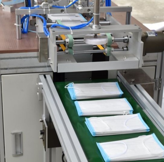 Medical surgical face mask making machine line consists of components to finish the whole procedure of producing surgical face masks or disposable face masks, consists of conveyor devices for delivering the raw materials(layers of non-woven fabric, nose clip metal wire, earloops rope), the cutting process(the mask body cutting, the nose clip cutting), the welding process of earloops, the folding process and etc.